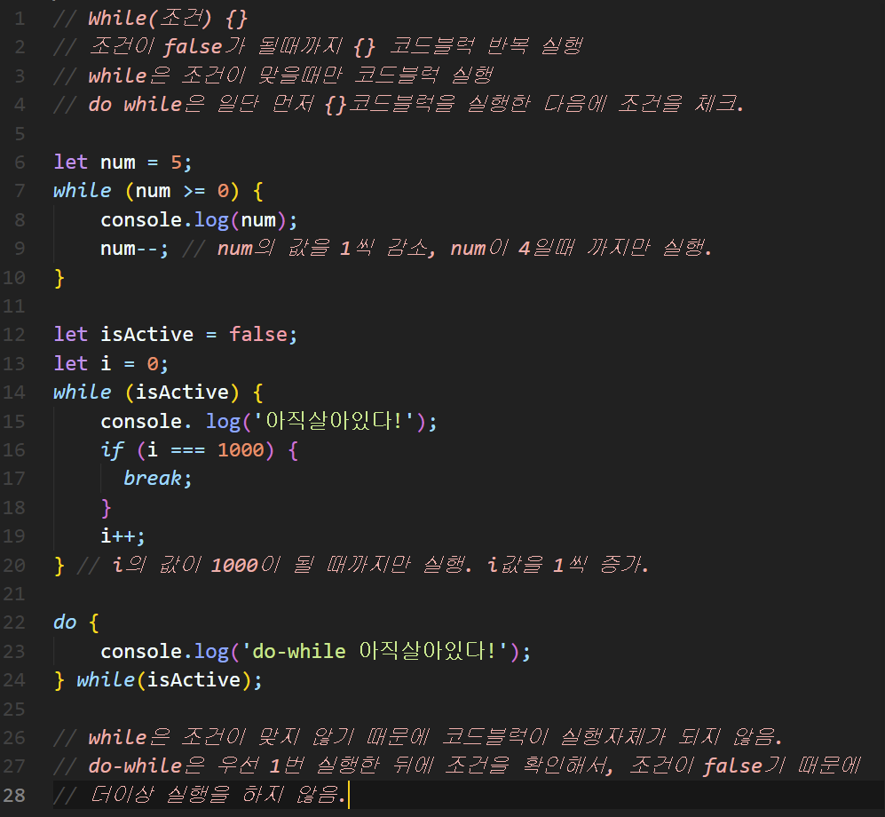 // 조건이 false가 될때까지 {} 코드블럭 반복 실행